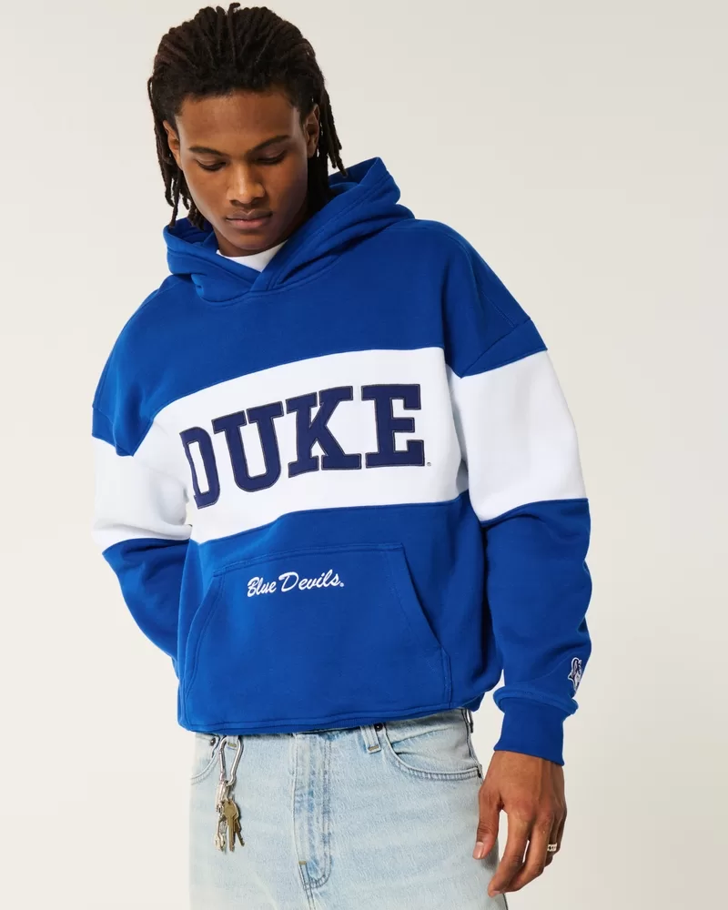 A super soft fleece hoodie featuring official licensed Duke University Blue Devils graphic embroidery and applique. Hood, front pouch pocket, long sleeves. Boxy Fit. Imported.