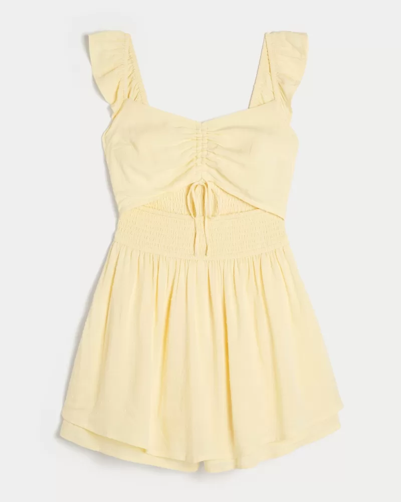 This super cute and soft mini romper has pockets and channeling through the waist. Front cutout detail with adjustable tie at center. Flutter sleeves. Imported.